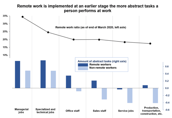 While the remote work ratio is high for occupations with large amounts of abstract tasks, such as managerial, specialized, and technical jobs, it is low for occupations with small amounts of abstract tasks, such as service jobs, production, transportation, construction, and so on. More importantly, abstract tasks become strikingly more numerous for workers working from home even for the same occupation. This suggests that there is room to increase possibilities for remote work by adjusting the nature of work and how it is conducted.
