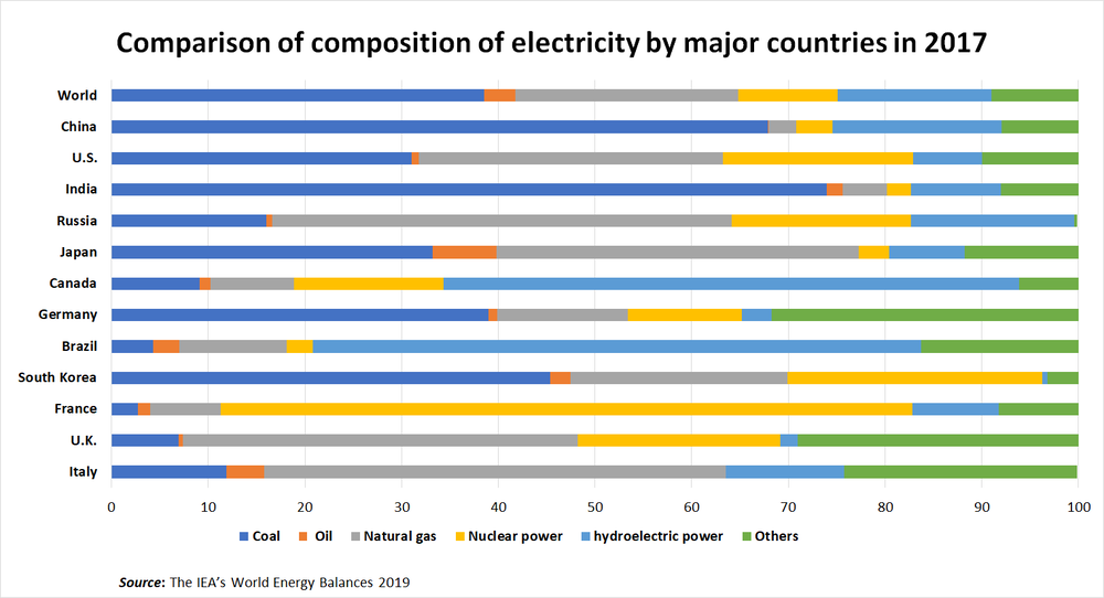 The figure shows the composition of electricity by source in 2017 from an international point of view. Globally, slightly less than 40% of electricity is from coal-fired thermal power. Ten European countries that committed to abolishing coal-fired thermal power by 2030, including France, Italy and the UK, are characterized by an extremely small percentage of their electricity coming from coal-fired thermal power. Energy policy is itself a national strategy. Countries therefore implement policies strictly in line with domestic conditions while considering national interest.
