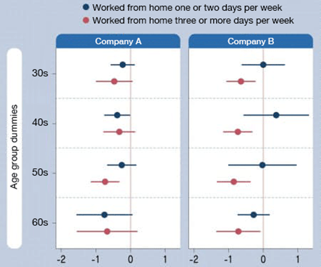 I conducted a survey on working from home together with Ms. Kuroda Sachiko, professor at Waseda University, and Ms. Okudaira Hiroko, associate professor at Doshisha University. We compared productivity losses by age group before and after the issuance of the declaration of a state of emergency for all the workers from two manufacturing companies, and found that within the workers who worked from home three days or more per week, productivity losses were observed for all workers in their 30s or older compared with their 20s, but especially in their 50s (see the Figure).