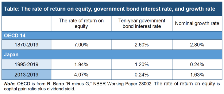 Turning to the situation of Japan in recent times, over the past 25 years, on average the rate of return on equity has been higher than the growth rate and interest rate, while the growth rate has been lower than the interest rate (see Table). However, during the seven years of Abenomics, the growth rate has been higher than the interest rate.