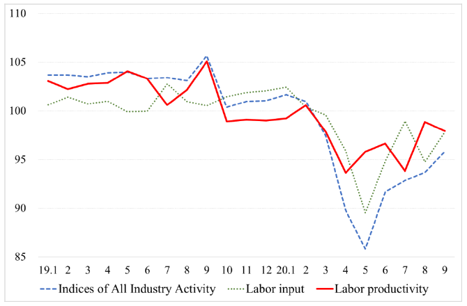 The figure below shows month-by-month changes in the overall productivity of the Japanese economy. While production activity in May 2020 was down around 15% compared with the end of 2019, productivity declined only about 3%. Although productivity still remains below the level before the consumption tax rate hike, it recovered to almost the pre-COVID-19 level in August.