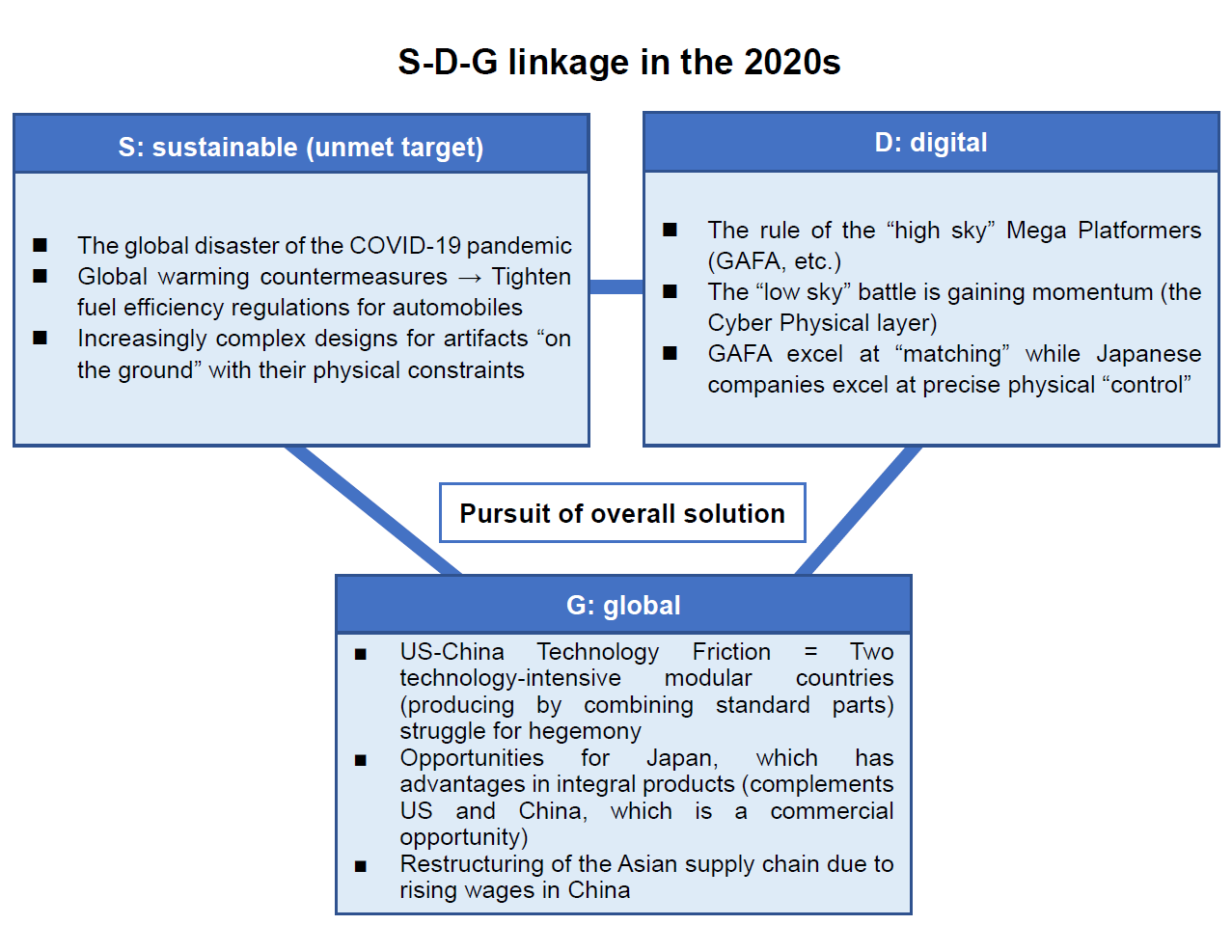These issues can be summed up as S for sustainability=crisis, D for digitalization, and G for globalization. The SDGs refer to the 17 Sustainable Development Goals presented by the United Nations in 2015 (the unfinished issues), but in the 2020s, industrial people and policymakers will have to think through the even greater S-D-G linkage, which also includes the Sustainable Development Goals. The overall optimum solutions that seek to solve these enormous simultaneous equations will be the effective solutions.