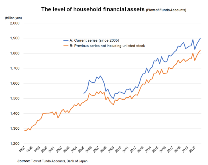 In economics, annual savings is a flow variable, and thus corresponds to the change in households’ holding of financial assets in a given year. Except for the short-term ups and downs due to fluctuating stock prices, household financial assets have continued to increase slowly but steadily during this period. The figure is a flow-of-funds table that presents data on the level of household financial assets. Looking at the growth rate, the average annual rate over the last decade was 2.4% (including stocks, A series in the figure) but in the period 2005–09 (ditto), it was 1.7%, so the increase in asset growth has accelerated in recent years.