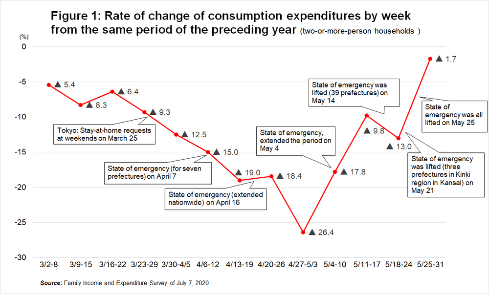 In July 2020, the Statistics Bureau, Ministry of Internal Affairs and Communications (Statistics Bureau) published the Family Income and Expenditure Survey for May, which included statistics on consumption expenditures by week as a special appendix to the survey. The statistics are normally by month, so this is an interesting appendix for the COVID-19 pandemic. Looking at the consumption trends by week around the time of the first wave of COVID-19, consumption started a monotonous descent in March, reaching -26.4 points after the declaration of the state of emergency (April 7, 2020) and at the bottom of the first wave, meaning between April 27 and May 3. It stayed negative after that and kept dropping until May 31.