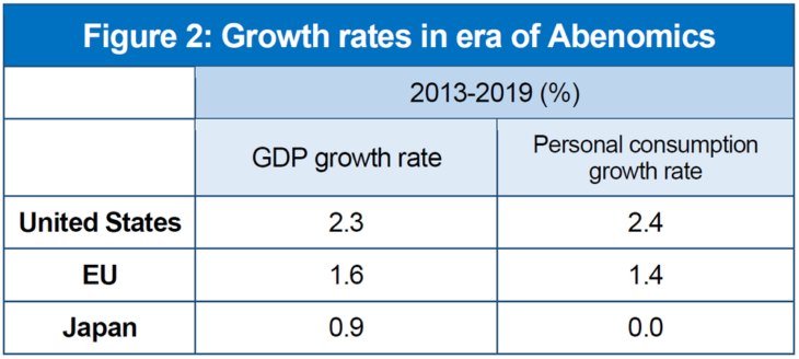 Let us compare the growth rate of the Abenomics period with those of other advanced countries. We can look at the period until the fourth quarter of 2019. This is a once-in-a-century extraordinary situation, so it makes no sense to compare the numbers after entering 2020. As such, we will limit the comparison to the seven years or so of Abenomics that cover the calendar year period from 2013 through 2019. Figure 2 shows a comparison of real growth rate for GDP and personal consumption between the United States, the EU and Japan.