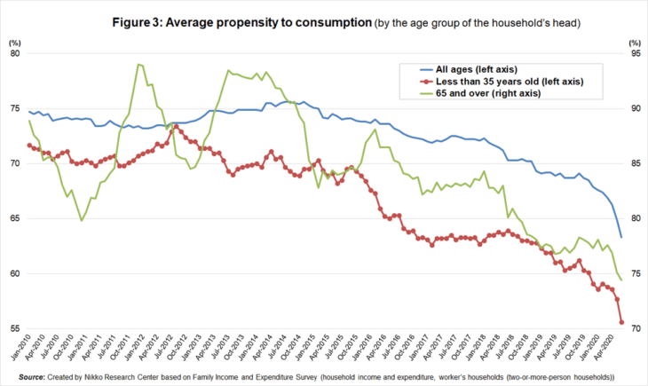 In the case of Japan, propensity to consumption has collapsed entirely. To state it roughly, the big issue of the Japanese economy is the utter failure of consumption, which makes up more than 60% of GDP. There are two reasons. One is that wages do not rise, and incomes do not increase. The other is that the propensity to consumption is going down across generations, which means that people are saving. It is thought that the cause is this anxiety for the future in a broad sense.
