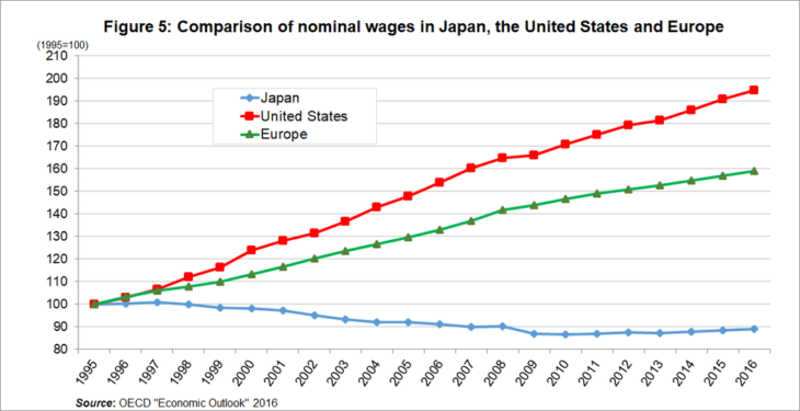 Rather, I think the key to Japan’s deflation is wage deflation. It used to be a deflation stopper that wages do not go down, but this stopper has been removed in Japan so that nominal wages have dropped.