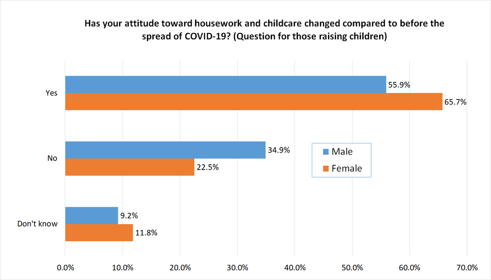 On a 10-point scale evaluating lifestyle satisfaction before and after the spread of COVID-19, the average number dropped from 5.96 before COVID-19 to 4.48. When we look deeper, the number for housewives with elementary school-aged children significantly dropped from 6.61 to 4.26, and the number for women, 60 and older, dropped from 6.51 to 4.42. Enjoyment and interest in life dropped from 6.33 to 4.38, and connection with society dropped from 6.07 to 4.32. All of these show anxiety and discontent through the burden of housework, requests for people to voluntarily refrain from going out, limited shopping, and restrictions even on having enjoyable conversations with friends.