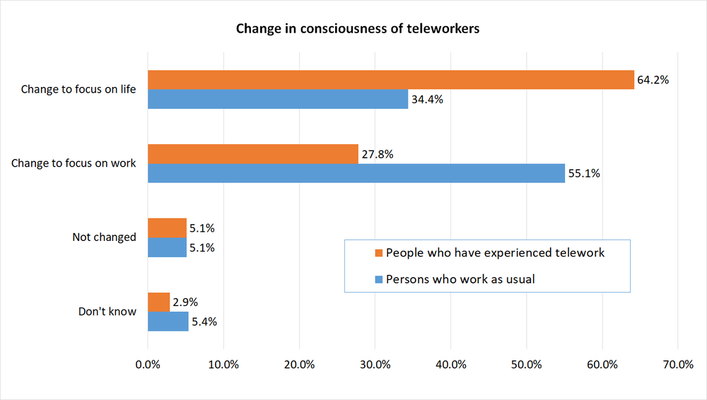 You can also see changes in awareness for these types of workers in the online survey. When asked whether they wanted to put more emphasis on their work or personal life, 50% of respondents answered, “personal life,” with 55.9% of men raising children responding that their awareness had changed in relation to dealing with housework and child raising, as time spent at home has increased for both children and parents due to COVID-19. Of the 34.5% of people who had experienced teleworking due to COVID-19, 64.2% responded that their awareness evolved towards an emphasis on their personal lives. Additionally, 24.6% said they had greater interest in moving to rural areas, with 46.3% responding that they desired a change of vocation or a side job. Off-peak commuting and telework, which had not advanced despite the government working to promote it, took off due to COVID-19, and awareness has clearly evolved. For example, we can perhaps see the potential for change in the long-standing issues in Japan of a heavy concentration of people in Tokyo and depopulation in rural areas, as well as a stagnant labor market.